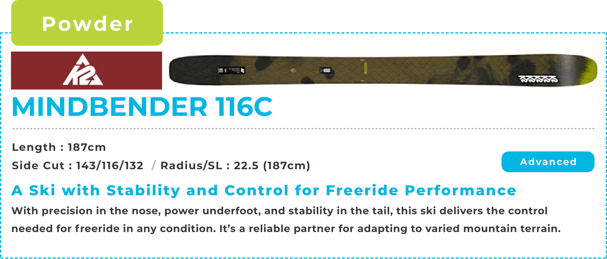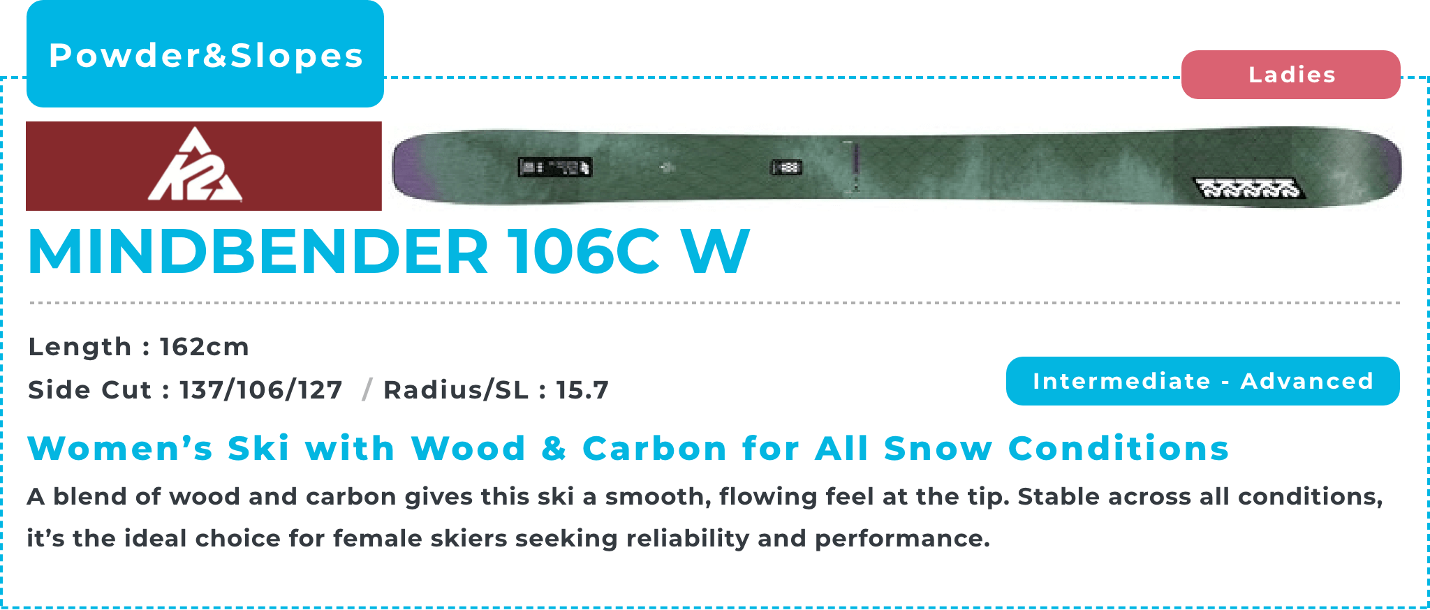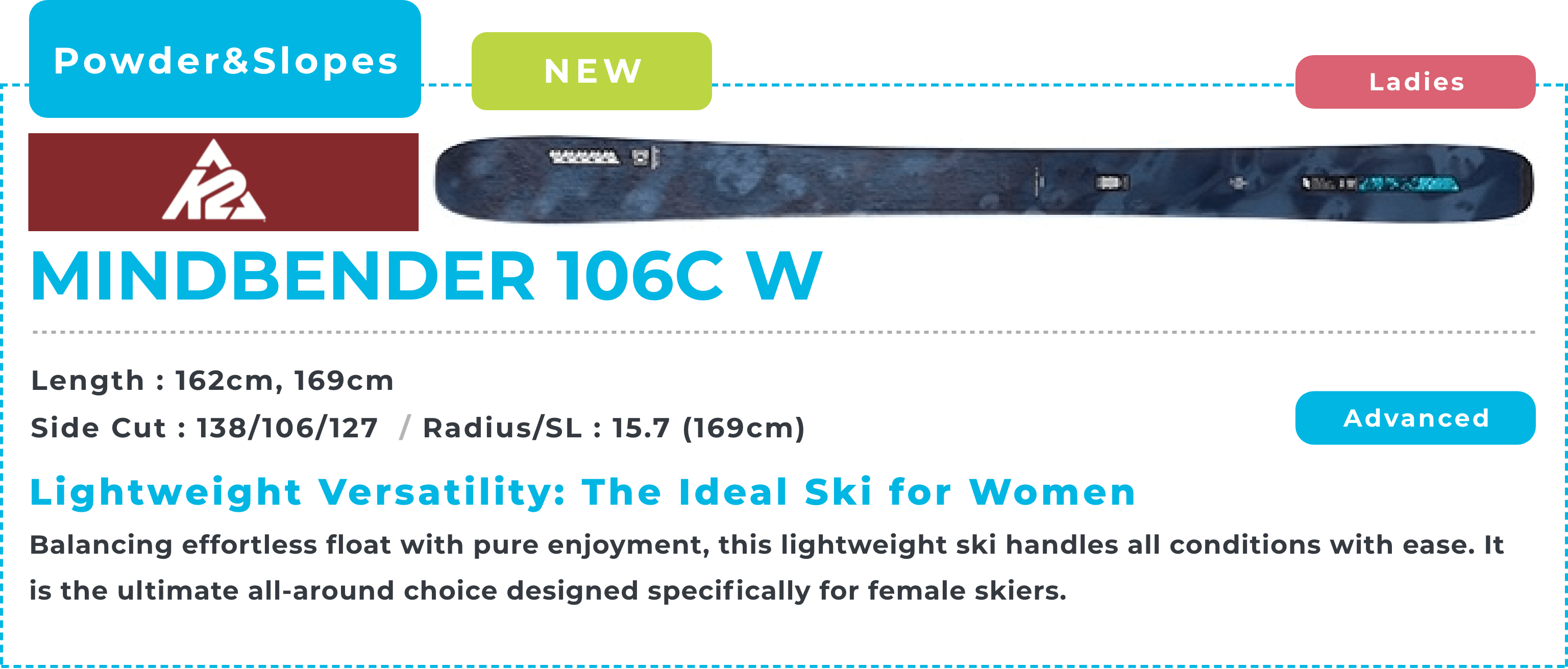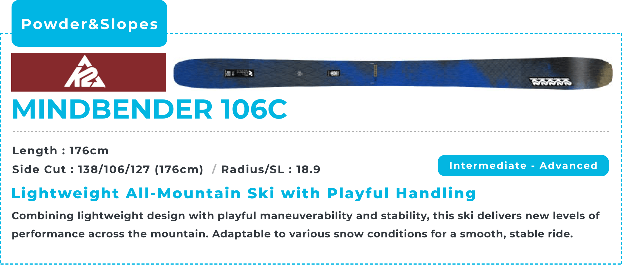 K2’s new Mindbender 106C redefines all-mountain performance with a lightweight, fun design. Featuring an accessible waist width, it provides nimble and dynamic handling without compromising mid-range performance. This ski offers exceptional support and stability across various conditions, delivering high performance on all-mountain terrains.