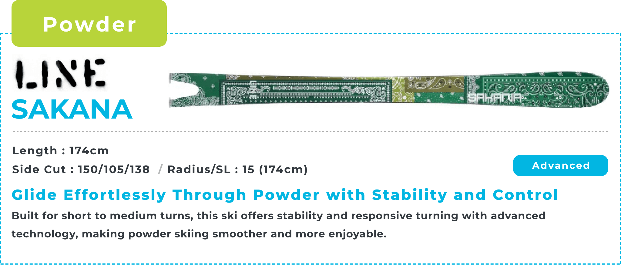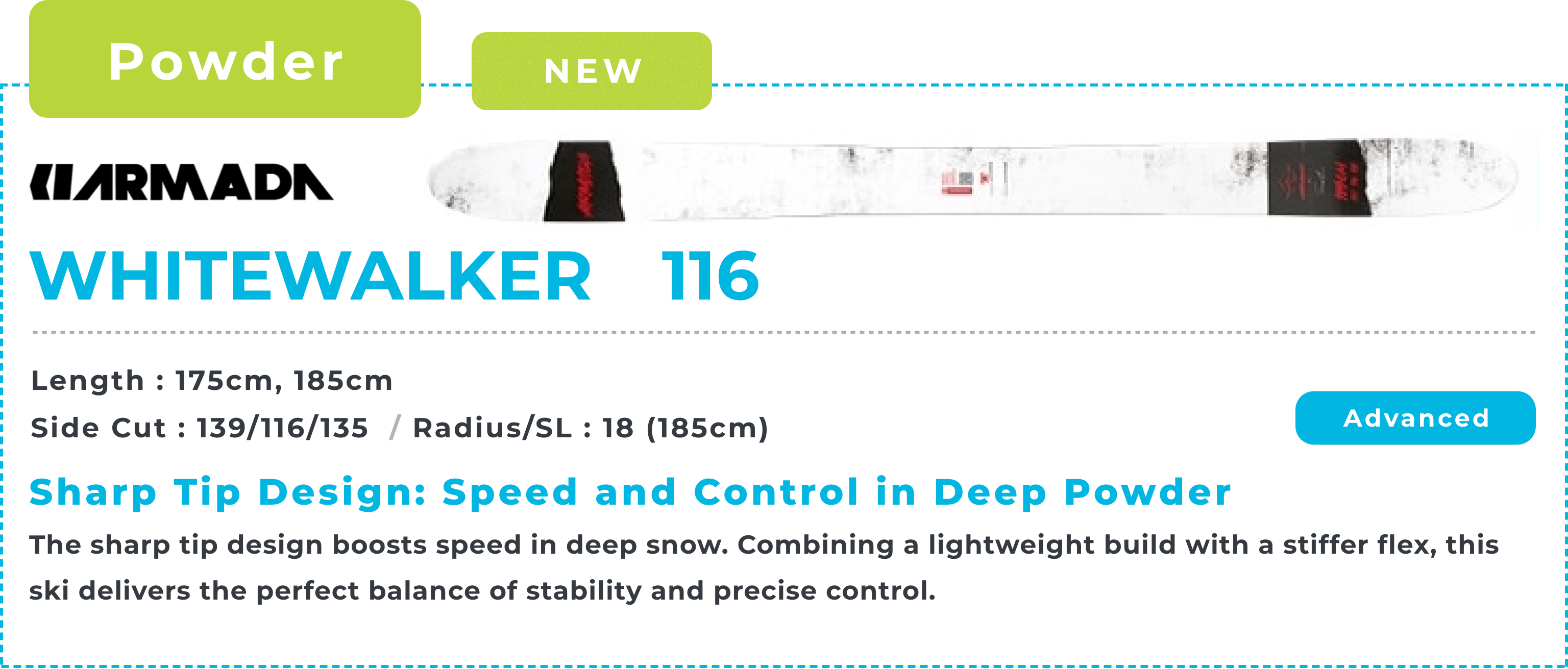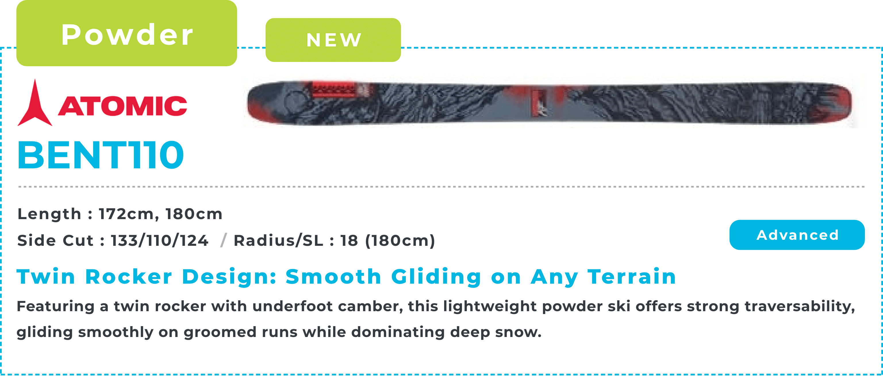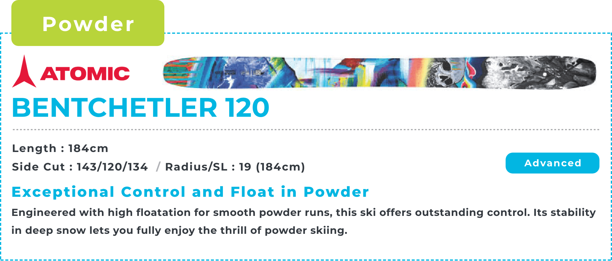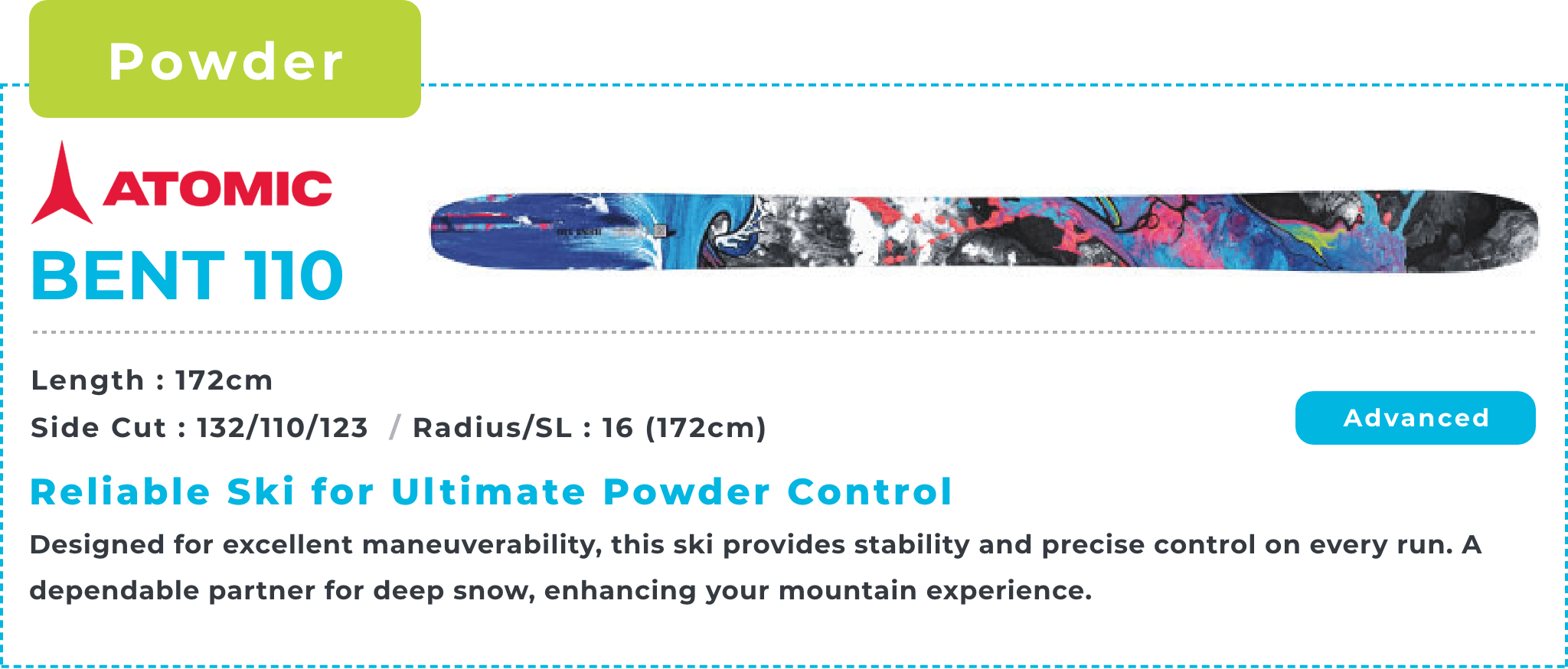 Focusing on short to medium turns, this model combines advanced technology for stability with responsive turning capability, enhancing the joy of powder skiing. Its unique swallowtail design and wider shovel, combined with an early rise tip, deliver a surf-like experience in powder. Meanwhile, the rear-mounted stance and solid camber ensure steady carving on harder snow.