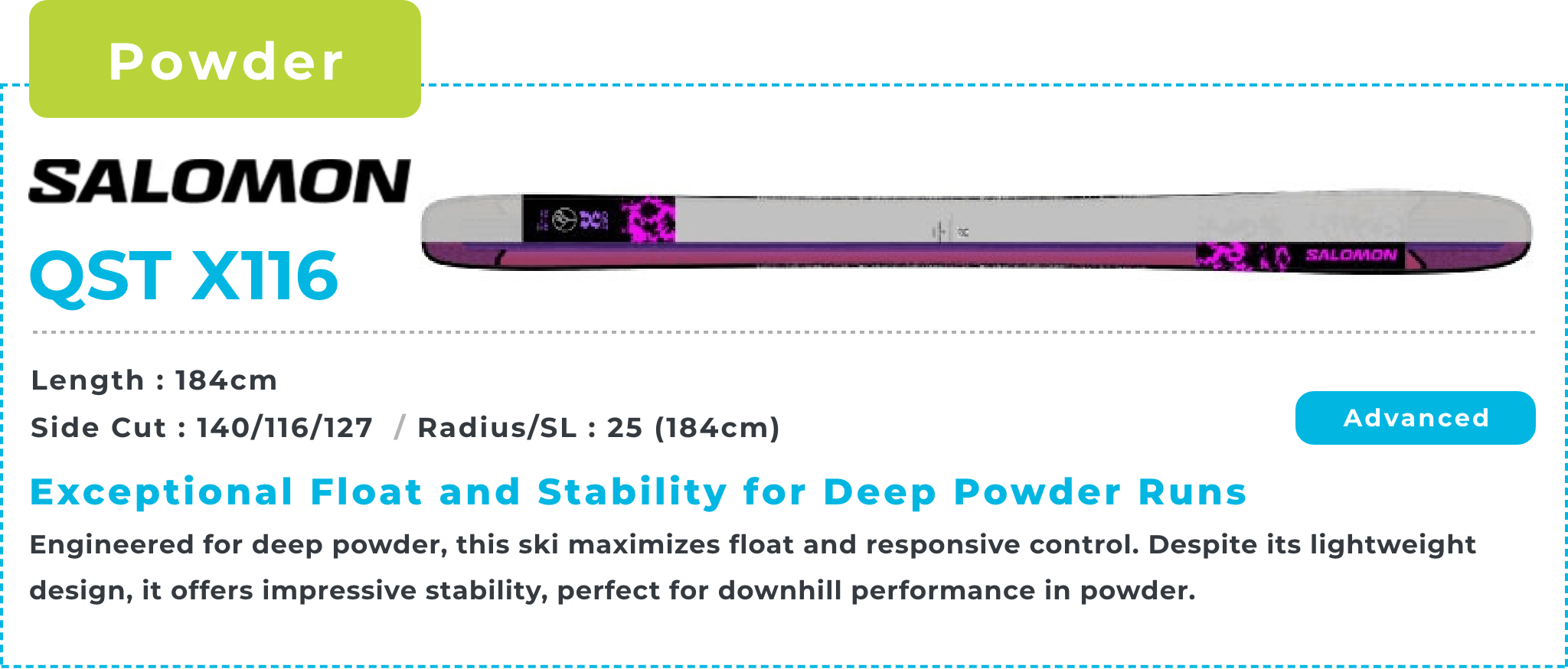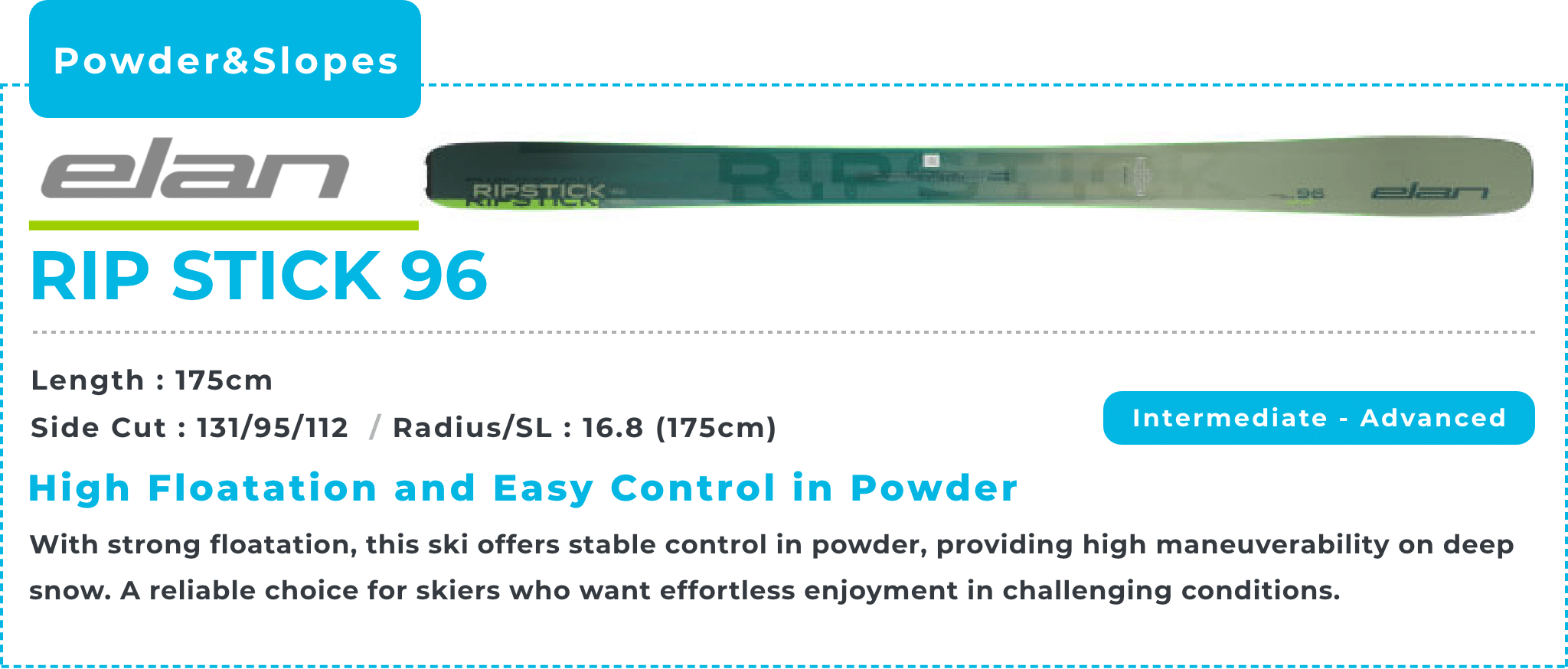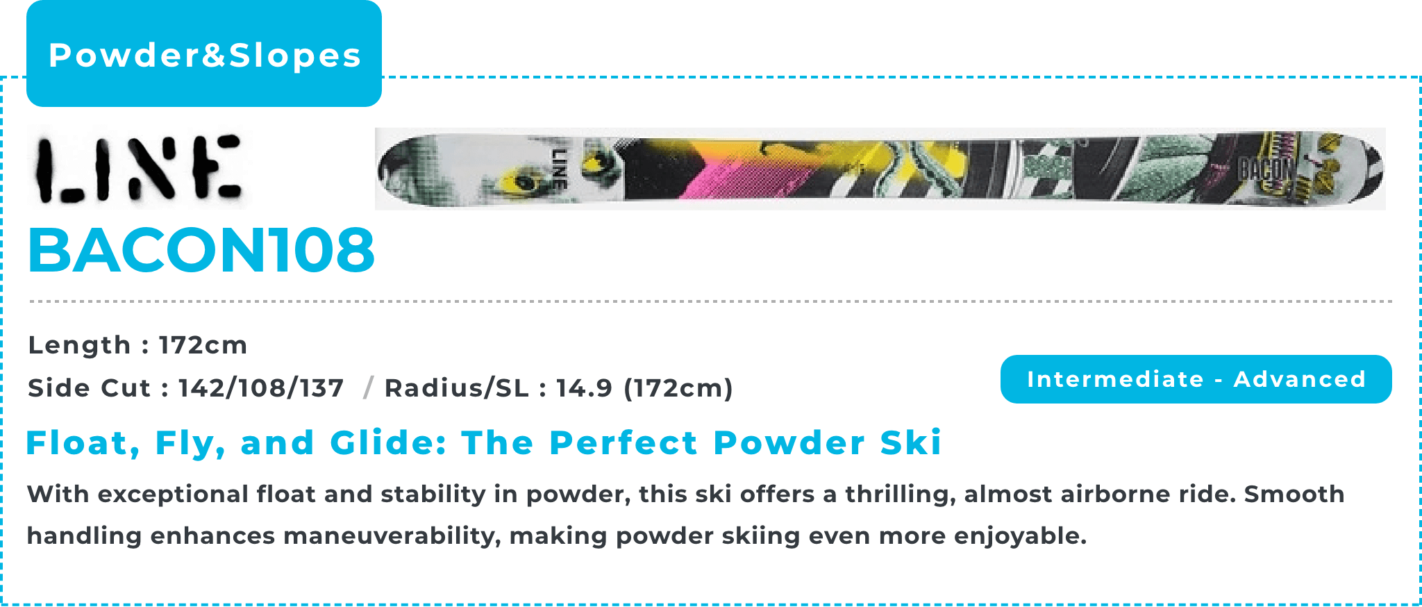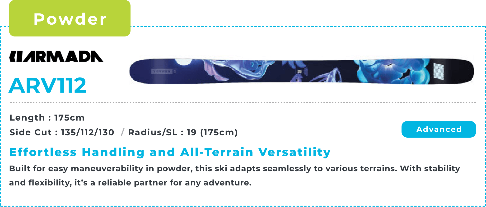 Focusing on short to medium turns, this model combines advanced technology for stability with responsive turning capability, enhancing the joy of powder skiing. Its unique swallowtail design and wider shovel, combined with an early rise tip, deliver a surf-like experience in powder. Meanwhile, the rear-mounted stance and solid camber ensure steady carving on harder snow.