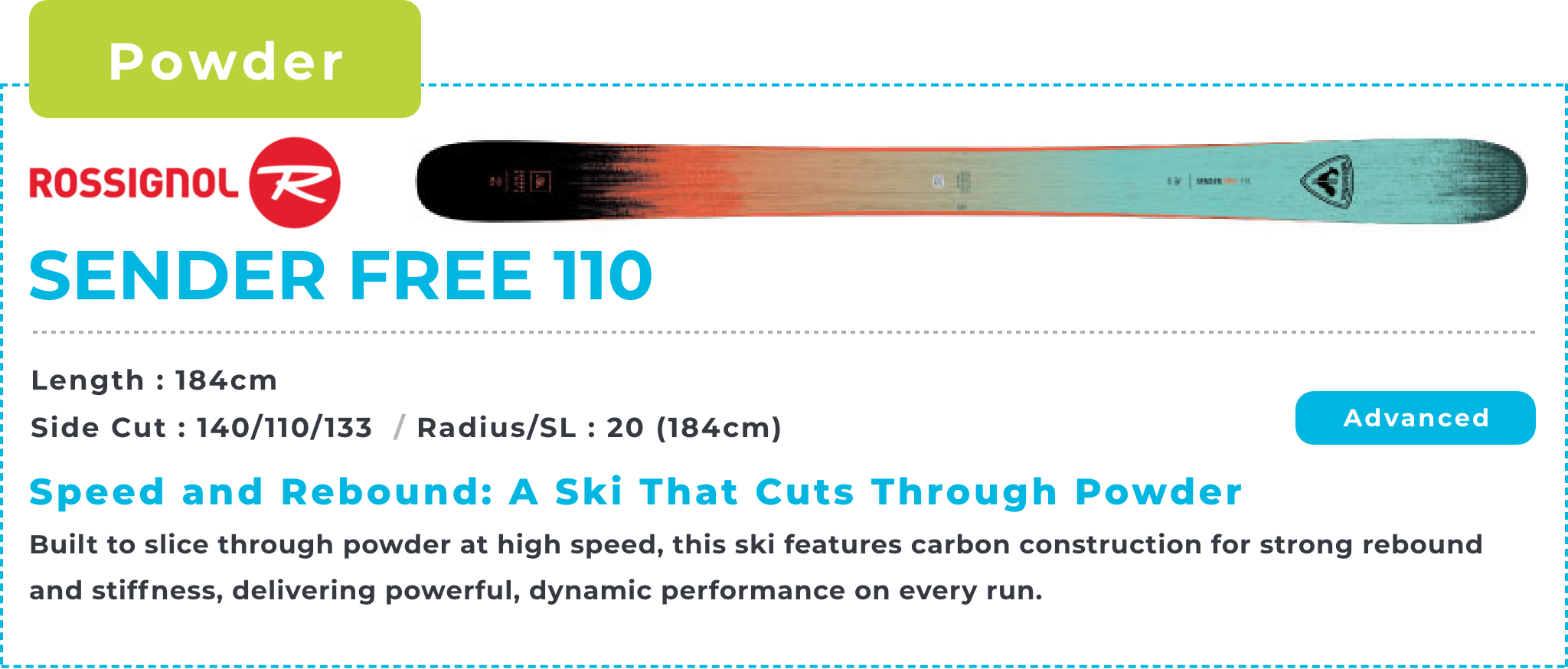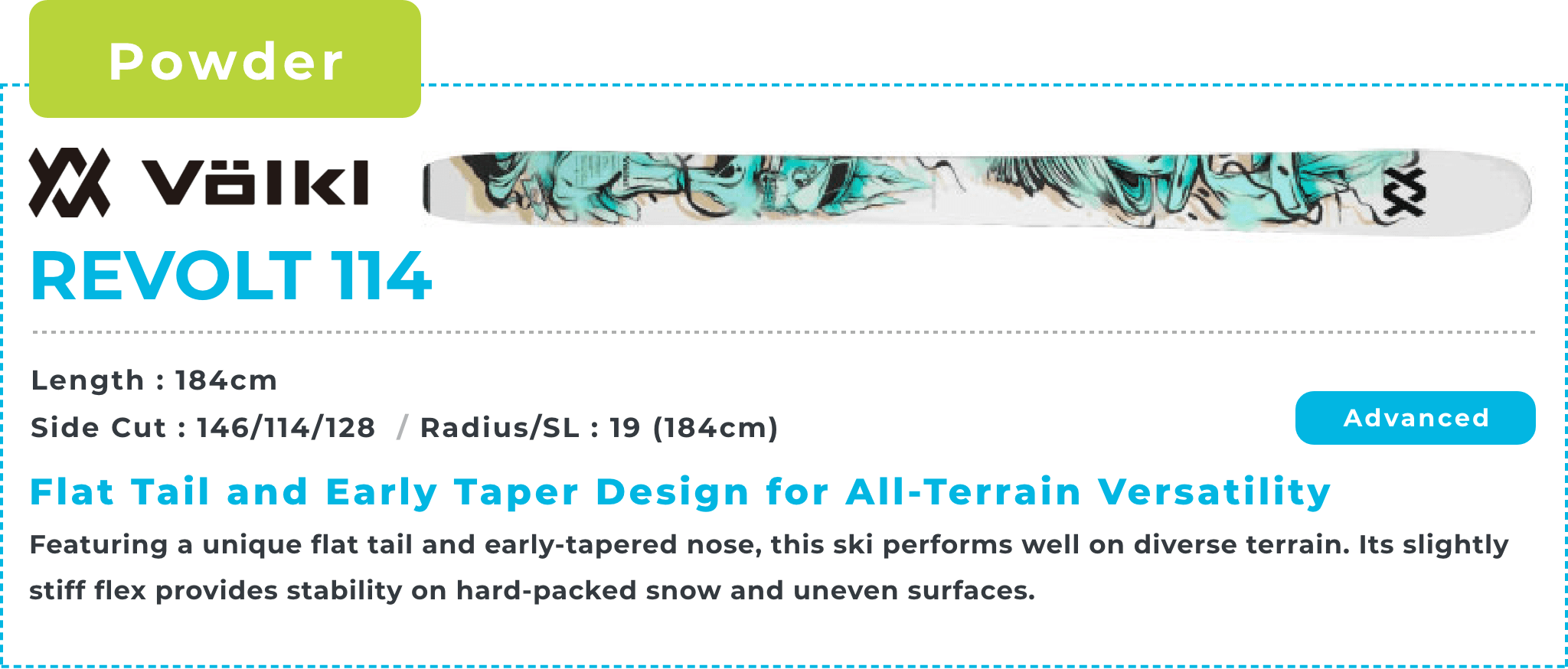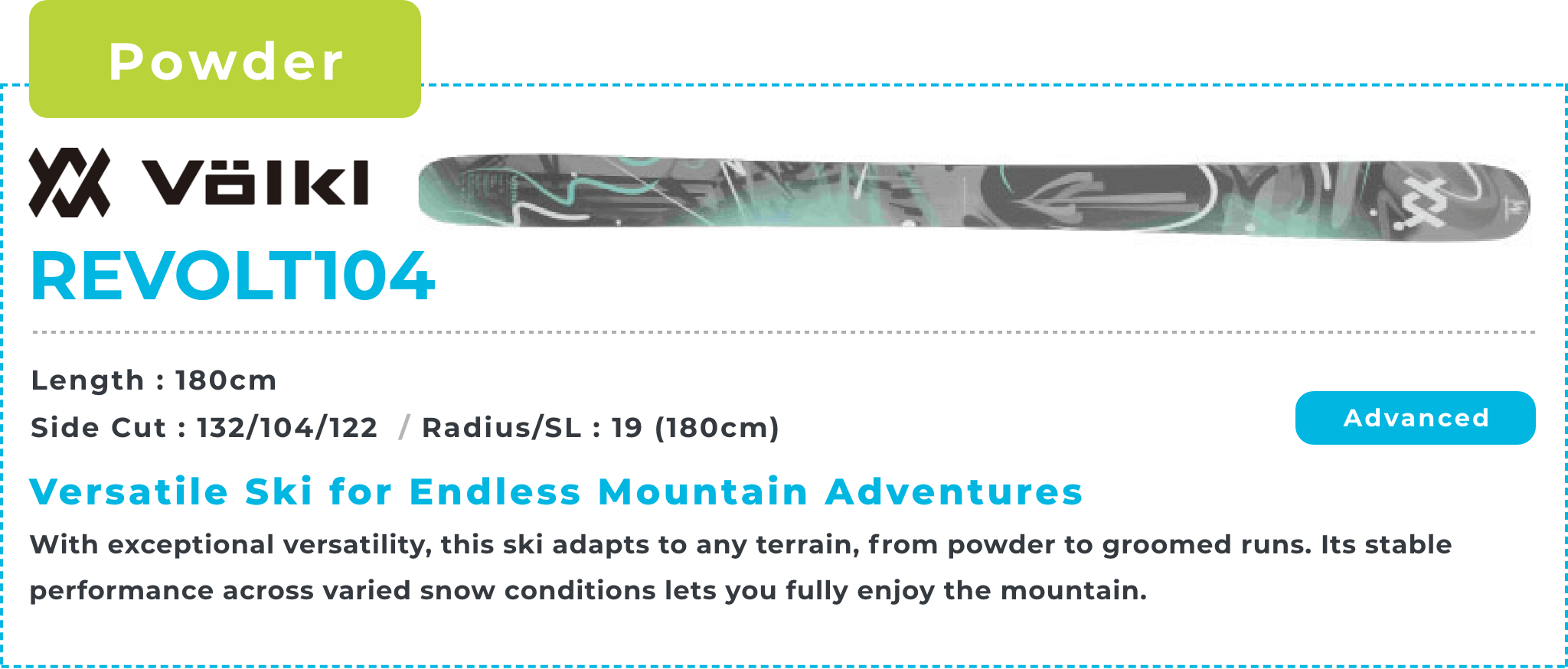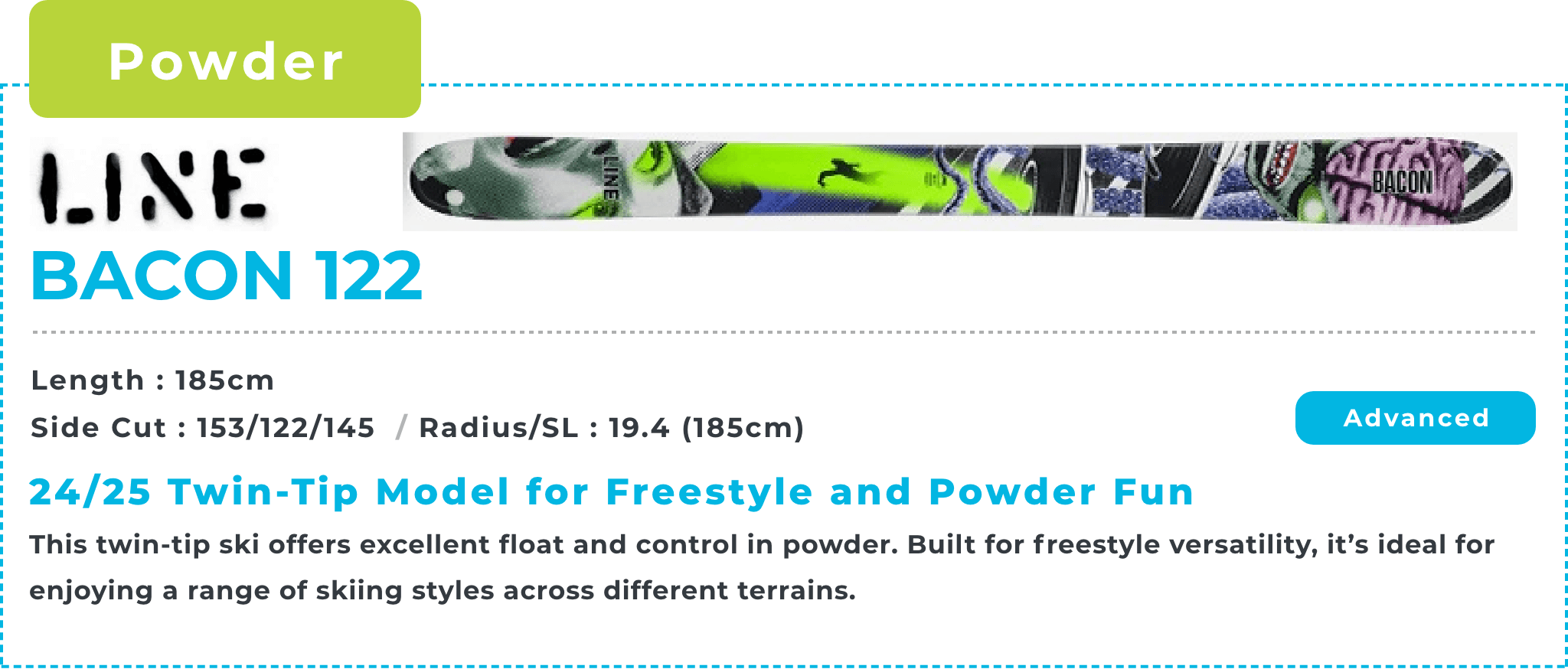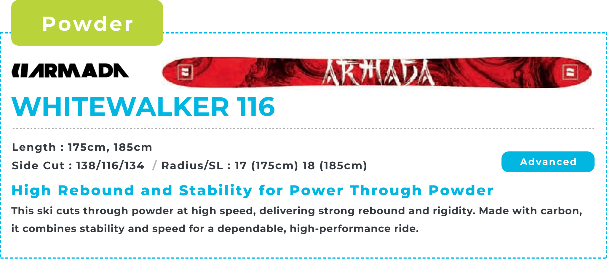 Focusing on short to medium turns, this model combines advanced technology for stability with responsive turning capability, enhancing the joy of powder skiing. Its unique swallowtail design and wider shovel, combined with an early rise tip, deliver a surf-like experience in powder. Meanwhile, the rear-mounted stance and solid camber ensure steady carving on harder snow.