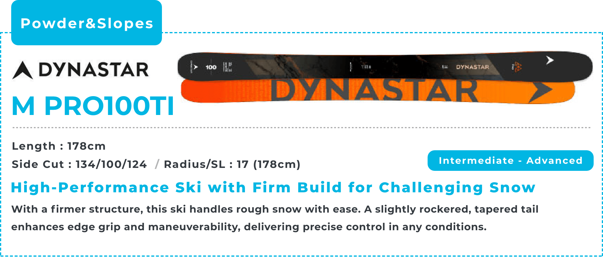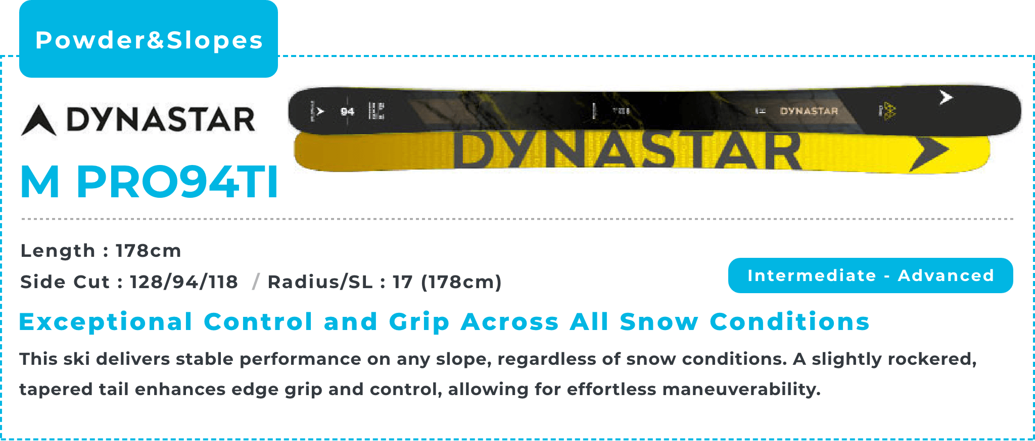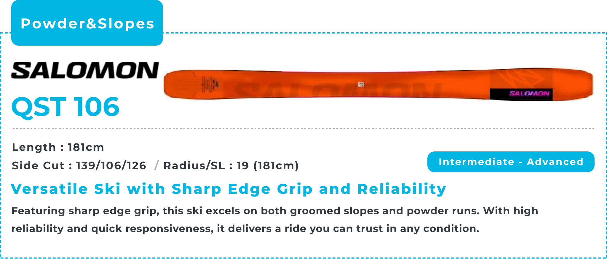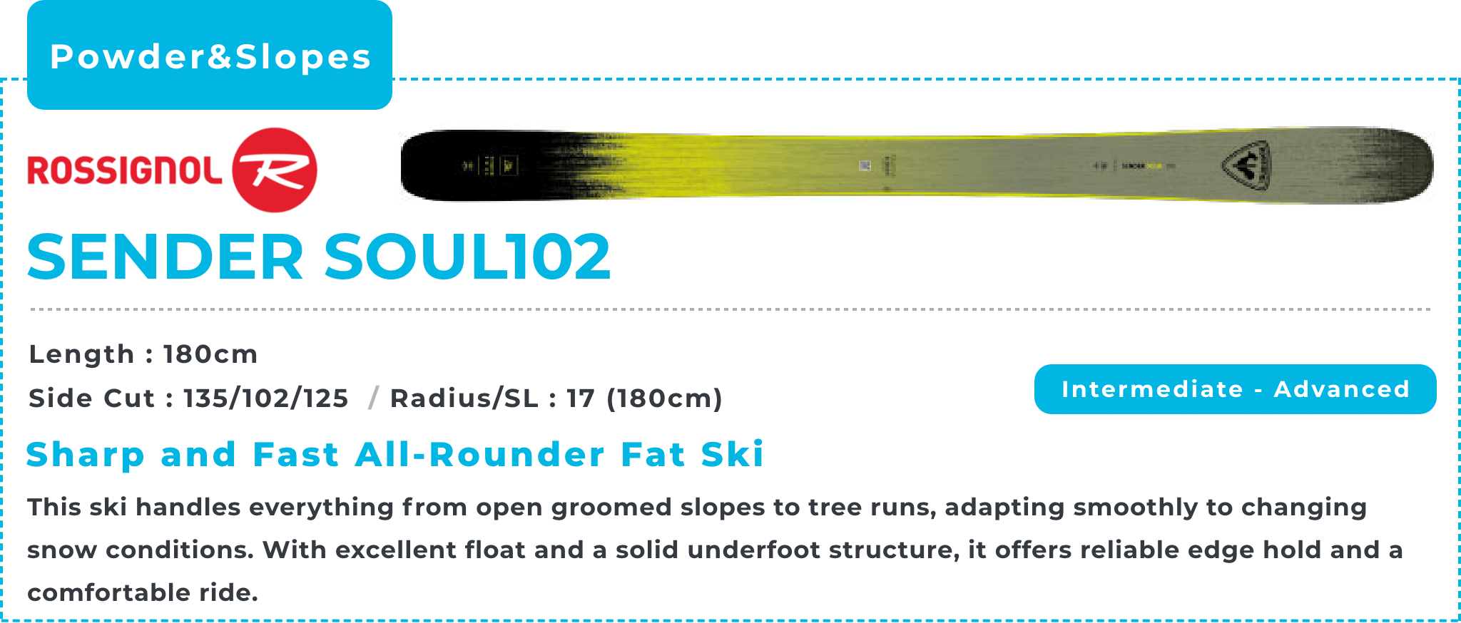 Focusing on short to medium turns, this model combines advanced technology for stability with responsive turning capability, enhancing the joy of powder skiing. Its unique swallowtail design and wider shovel, combined with an early rise tip, deliver a surf-like experience in powder. Meanwhile, the rear-mounted stance and solid camber ensure steady carving on harder snow.