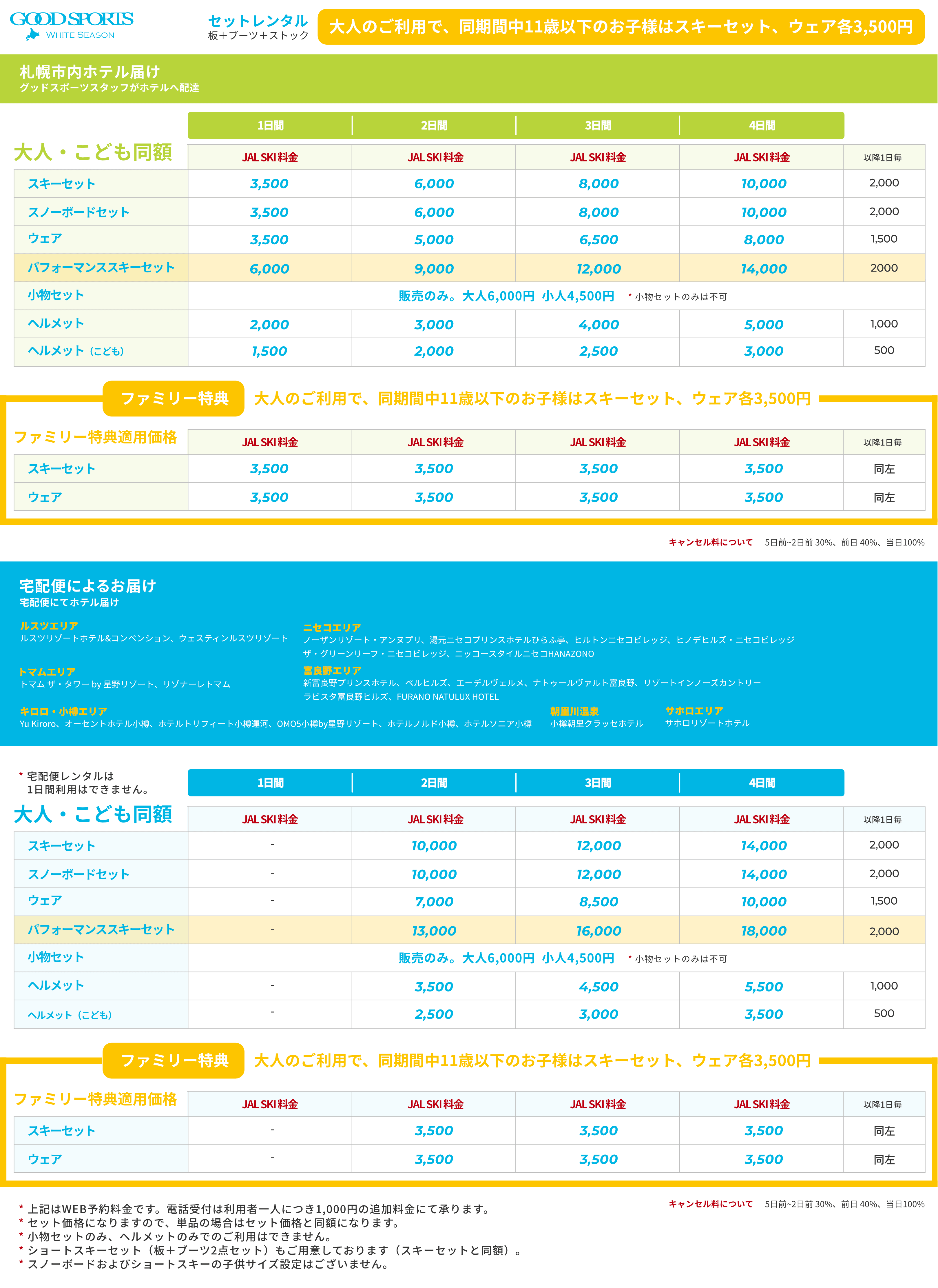 グッドスポーツ札幌営業所 札幌地区ご宿泊のお客様へ 初日に空港から直接スキー場(※1)へ移動、または、最終日にスキー場(※1)から空港へ直接移動のお客様は、宅配便にて直接スキー場へお届け(ご返送)で承ります。ただし、ご予約はお電話のみとなりますので、ご出発日の5日前までにお電話にてご予約ください。 011-624-8011 |